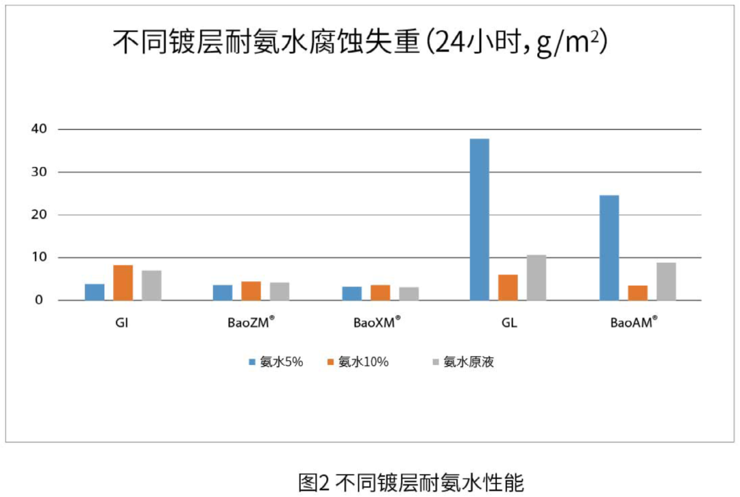 在氨水試驗中,熱鍍鋅、BaoZM®、BaoXM®失重均比鍍鋁鋅和BaoAM®低(圖2)。
