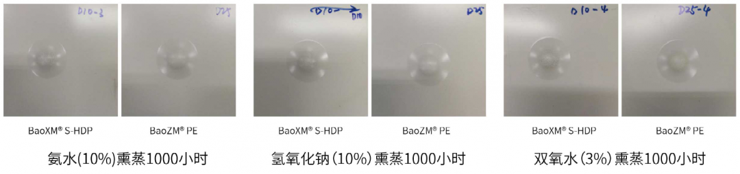 采用BaoZM®和BaoXM®基板的S-HDP涂層或者聚酯(PE)涂層鋼板經過杯凸加工后,在1000小時氨水、氫氧化鈉、雙氧水熏蒸下,涂層均完整。