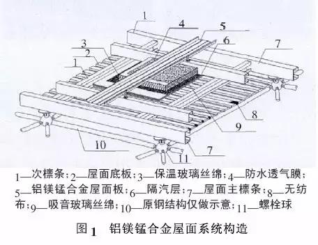 1.1 鋁鎂錳合金屋面系統(tǒng)構(gòu)造典型的鋁鎂錳合金屋面系統(tǒng)構(gòu)造,如圖1所示。