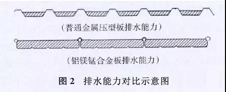 2)最大限度地利用面板橫截面積排水,排水效率高。與普通金屬壓型板排水能力對(duì)比,見(jiàn)圖2;