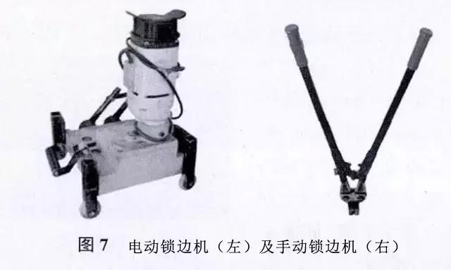 2)手動(dòng)鎖邊機(jī),在用電動(dòng)鎖邊機(jī)之前先用手動(dòng)鎖邊機(jī)鎖緊板端,以便于電動(dòng)鎖邊機(jī)入位,見(jiàn)圖7(右)。