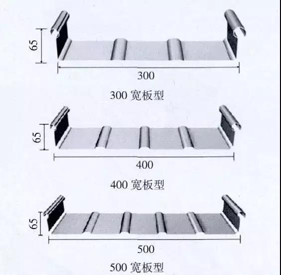 直板板型肋高一般為65 mm,常用的板寬有300mm、400 mm 及500 mm(圖9)。其中板寬300mm 的在屋面荷載較大時(shí)使用;400 mm 的為常用、經(jīng)濟(jì)型的;500 mm 的為屋面板本身最經(jīng)濟(jì)的板型,但下部檁條間距小,且需采取適當(dāng)措施防止板變形。板型詳況,見(jiàn)圖10。