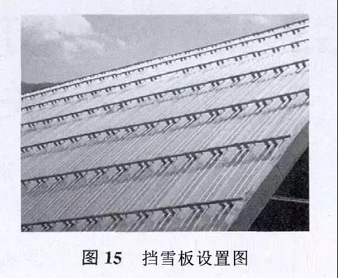 北方地區(qū)的屋面一般需要設(shè)置擋雪板。擋雪板材質(zhì)一般為不銹鋼或鋁合金。擋雪板可根據(jù)屋面的基本雪壓和坡度來(lái)布置。天溝及檐口上方必須設(shè)置擋雪板,擋雪板的設(shè)置見(jiàn)圖15。