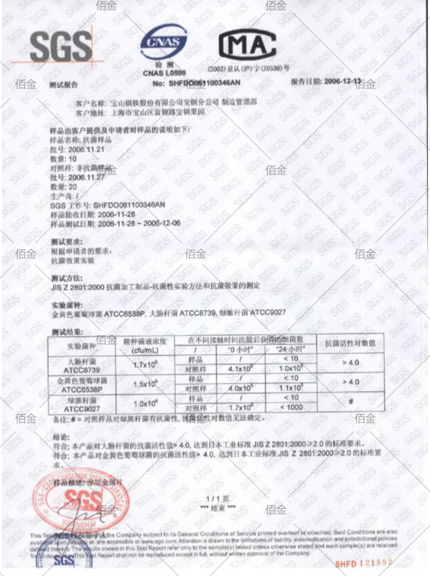 抗菌彩板涂層中由于使用了特殊搪瓷系列抗菌劑,具有無(wú)毒性及半永久性抗菌效果和遠(yuǎn)紅外線輻射效果,它特殊的面漆設(shè)計(jì)可以殺死大腸桿菌、金黃色葡萄球菌和綠膿桿菌等常見(jiàn)細(xì)菌,